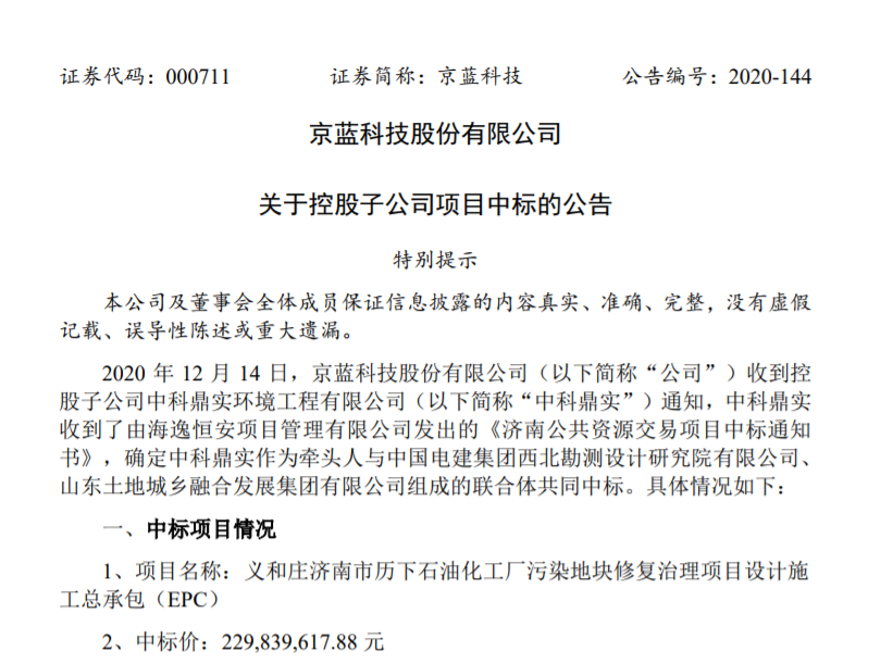 公告显示,中标项目名称为义和庄济南市历下石油化工厂污染地块修复治理项目设计施工总承包(EPC),中标价为2.3亿元;完成生态环境主管部门综合验收报告评审通过并备案前的所有工作,暂定完成时间为2021年3月31日。